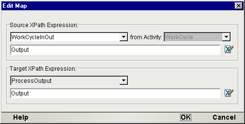 Using the pulldown menu immediately under Source XPath Expression, select the message that you want to use as the data source for this mapping. The prepopulated list will contain output message names from all available (legal) data sources. (In other words, you can choose to map data from any activity that can be reached by back-traversal of links. This includes the ProcessInput message itself.)