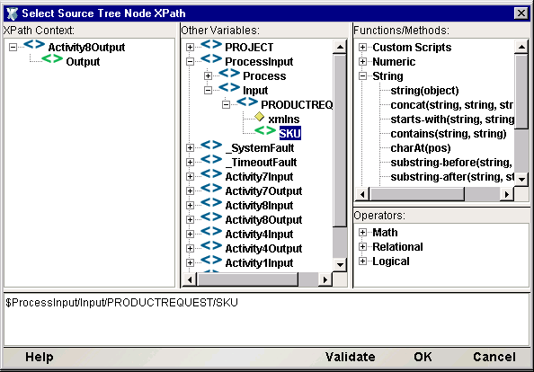 The upper panes of this editor window are prepopulated with message trees, XPath native script methods, etc., for your convenience in building XPath expressions. Doubleclick any node in any tree to make the correct sub-expression appear in the edit field. Click OK to go back to the Edit Map dialog.