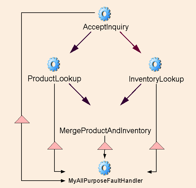 Because faults can be handled by custom-designed activities (which in turn can be implemented as Web Services, Composer Components, etc.), fault logic can be as sophisticated as it needs to be. You can designate one fault handler activity for each activity that needs one (its implementation could even consist of the same Composer component in each case); or you could have a single fault-handling activity that handles all faults for the entire process. An example of the latter is shown in the graph below. Every activity has a link to MyAllPurposeFaultHandler, which handles faults for the entire process.