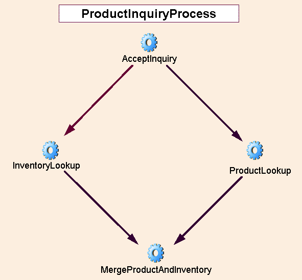 The ProductInquiryProcess model handles a request for product information. The input to the process is an XML DOM containing a SKU (product ID) number. The output of the process is an XML DOM containing detailed information about the product in question. The needed product information is pulled from two sources (two databases) via JDBC.