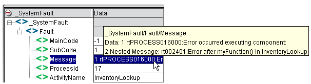 Every System fault contains MainCode, SubCode, Message, ProcessID, and ActivityName elements. The content of each element is visible in a rollover tooltip as shown above for the Message element. Notice that the Fault/Message element contains a Nested Message. The value of this Nested Message is whatever custom string value you put in any Log or Raise Error action (assuming the implementation is a Composer service or component).