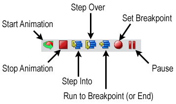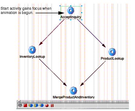Click the Animate button in the Process Designer toolbar. The start activity will highlight. (See below.) Also notice that a new toolbar appears at the bottom of the graph window. The icons, from left to right, are Animate (dimmed when active), Stop, Step Into, Step Over, Run to Breakpoint, Set Breakpoint, and Pause: