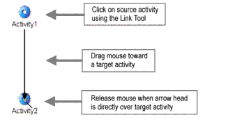 Without letting up on the mouse button, drag the cursor from the source activity to any activity that you want to be the target activity. As you drag around the canvas, the link arrow will "rubber-band" out as it tracks the mouse.