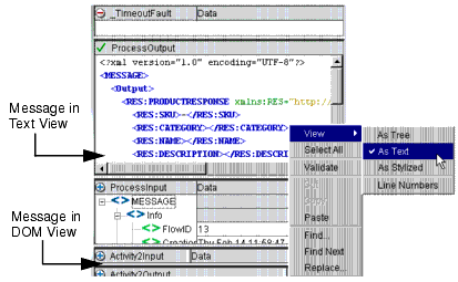 Any message produced at any point in a process can be displayed in DOM view, text view, or stylized view in its own pane. This includes ProcessInput, ProcessOutput, _TimeoutFault, and _SystemFault messages as well as all activity input and output messages.
