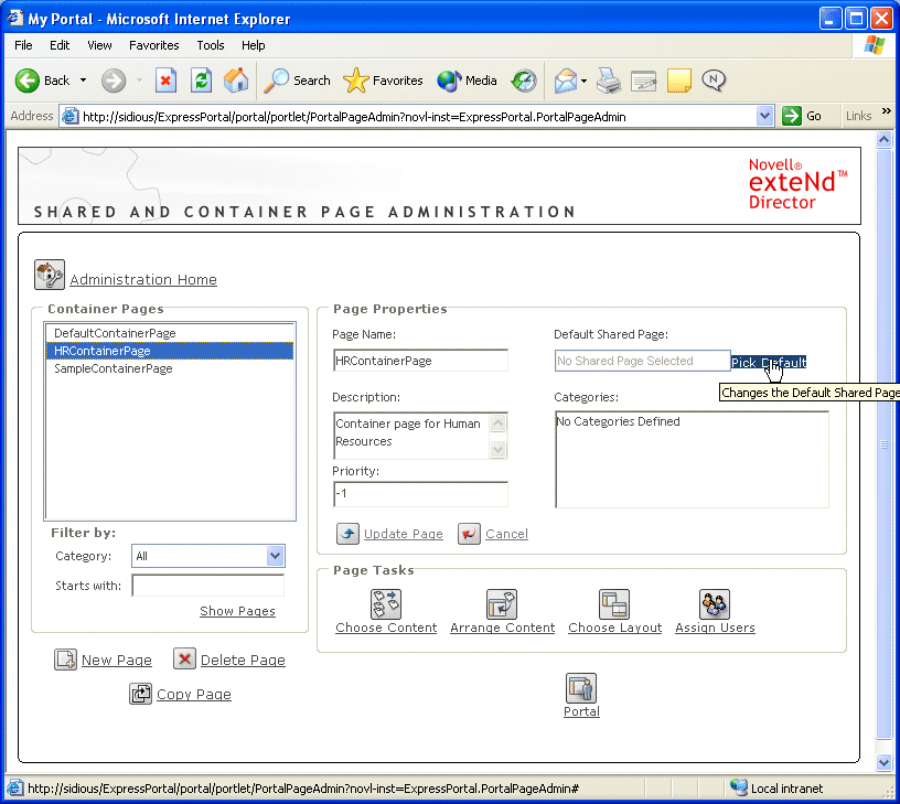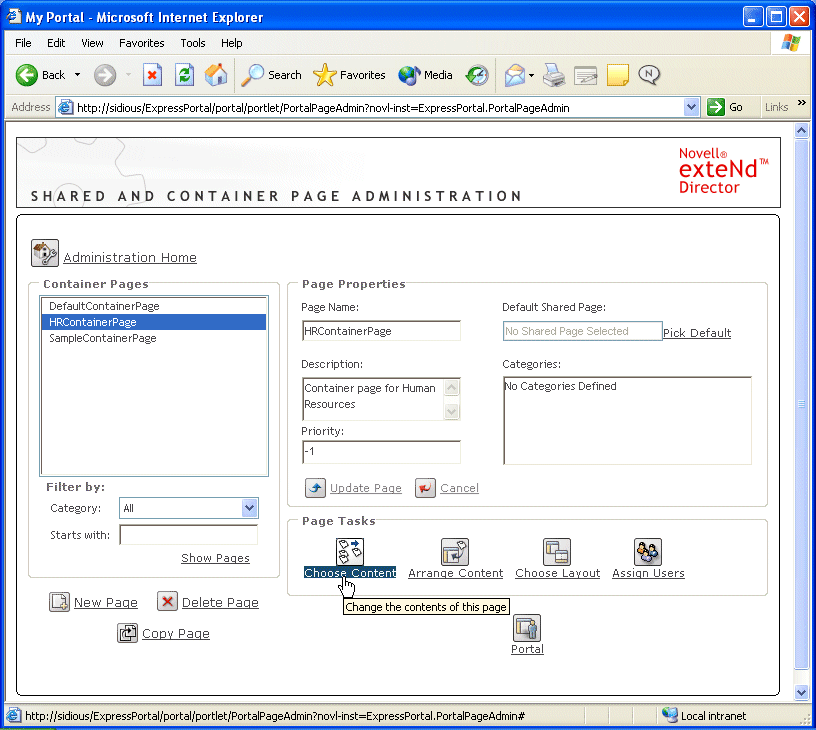 Portal administrators can create container pages from scratch or by copying existing pages. This section describes both procedures.