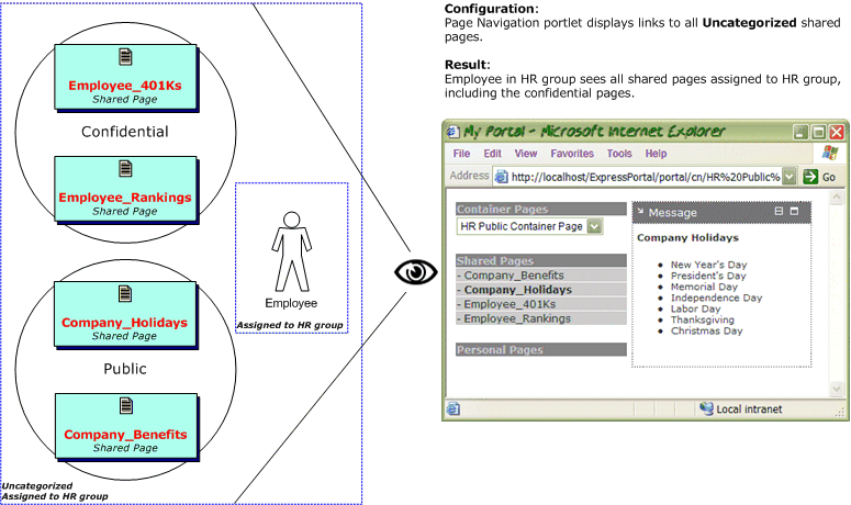 The administrator then configures the Page Navigation portlet on a container page to display links only to pages assigned to the category HumanResourcesPublic. By assigning this container page to the unauthorized employees in the HR group, the administrator allows them to view public HR pages, but restricts their access to the private ones, as shown: