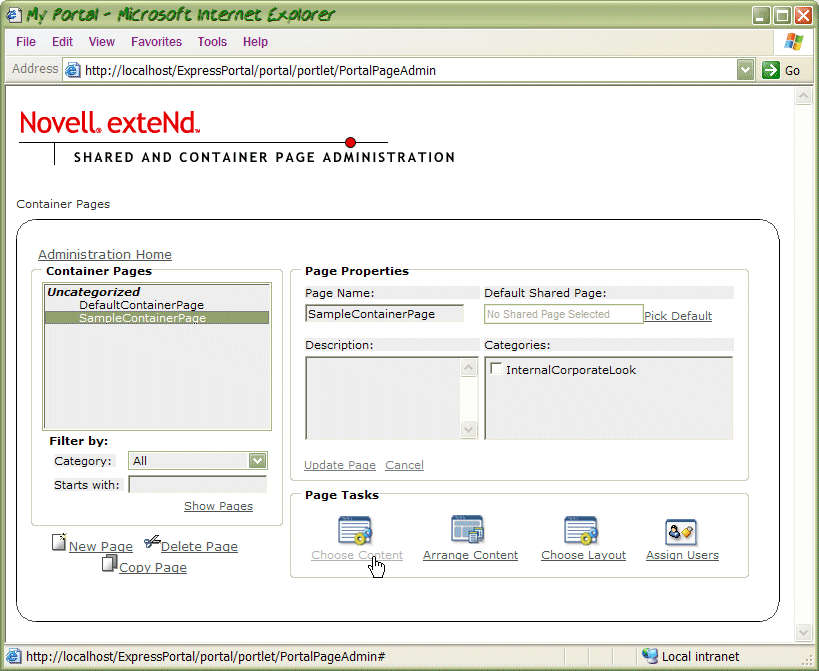 Select the desired container page from the list of pages returned and click Choose Content in the Page Tasks list: