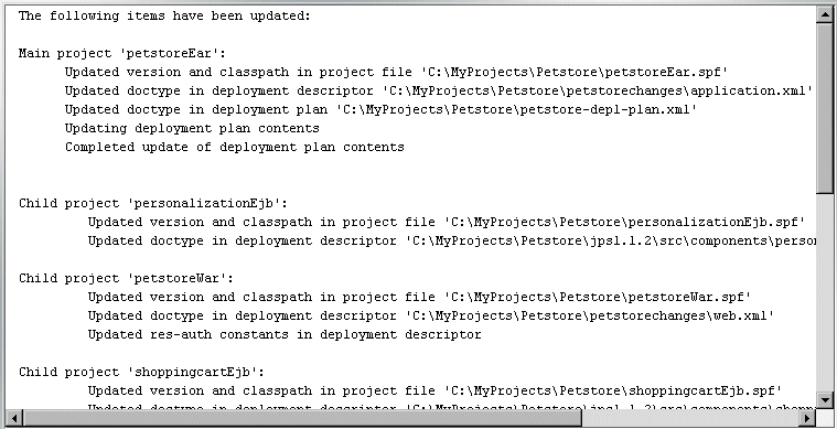 The update utility migrates the project from J2EE 1.2 to 1.3, then displays status information about:
