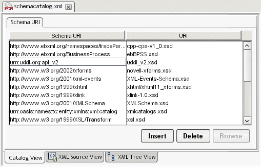 When you open a catalog entry file, it displays in the XML Catalog Editor. The XML Catalog Editor has three views: