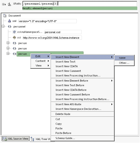 The XPath control in the XML Editor's Tree View is a subset of the XPath Navigator described in the chapter on working with scoped paths and XPaths in Developing exteNd Director Applications. See that chapter to learn about XPath expressions and how to use them. |
