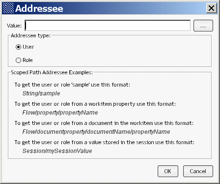 Specifying the addressee The addressee property determines where the workitem will be routed by the workflow engine. Each link can accept a single value for its Addressee property. Typically this value is a role, and the role defines a list of users with permission to perform work at the activity. You can also specify that the addressee value be dynamically derived at runtime from a workitem property.