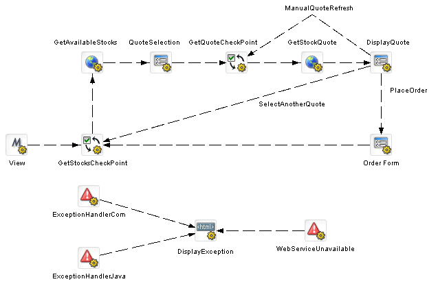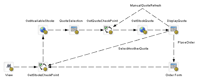 Note the inclusion of the ManualQuoteRefresh link in this flow. This highlights the difference between a rendering triggered by a request (represented by the ManualQuoteRefresh link) and one triggered by the browser or Portlet container. Also note that the links SelectAnotherQuote and ViewAvailableStocks target the GetStocksCheckPoint. A link directly to the QuoteSelection activity would not cause the GetStocksCheckPoint and GetAvailableStocks activities to run.