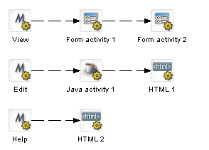 A pageflow can have multiple Mode activities. For example, a pageflow might have Mode activities that specify what happens when the flow is in View, Edit, or Help mode:
