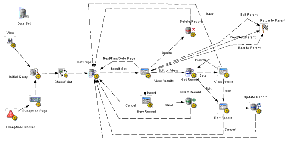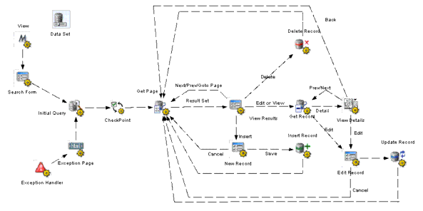 Flows that access a single table The following example shows a typical database pageflow used to access a single table: