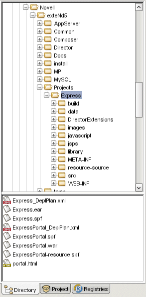 exteNd Director opens the Express EAR project and displays the Project tab of the Navigation Pane: