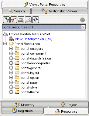 The Resources tab enables you to explore the Express Portal files based on how they participate in the application's resource set. It often provides the most convenient entry point when you need to examine or modify a particular aspect of an exteNd Director project.