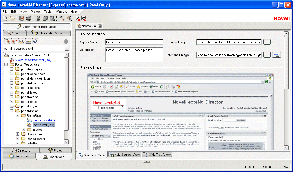 The BasicBlue theme descriptor opens in the theme descriptor editor (because this descriptor is a pre-supplied artifact, it is read-only). Now you can see how the BasicBlue theme is defined: