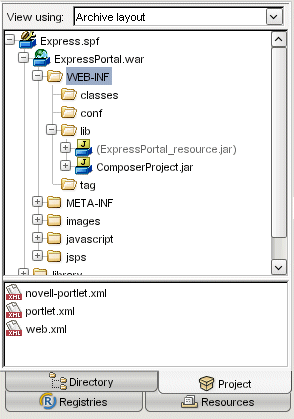 This gives you a J2EE-oriented look at the ExpressPortal project; it shows the ExpressPortal files based on how they will be organized in the WAR file generated for this project: