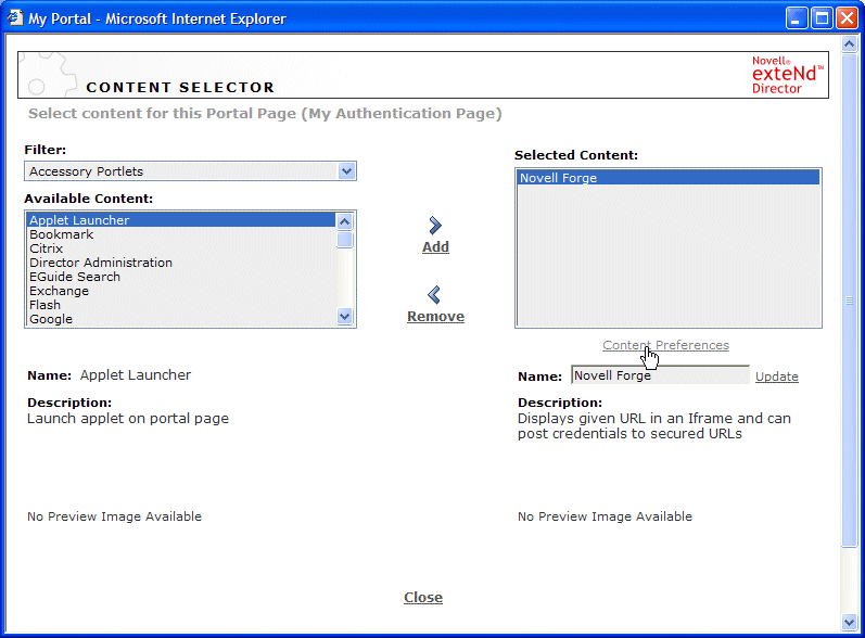 Choose Novell Forge in the Selected Content list, then click Content Preferences.