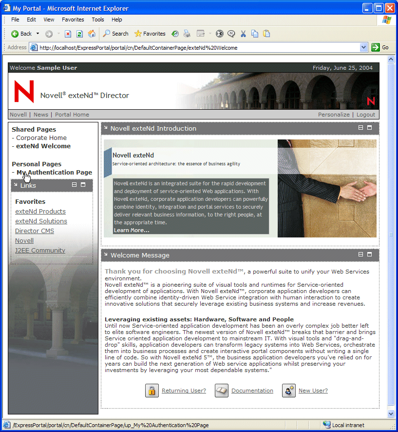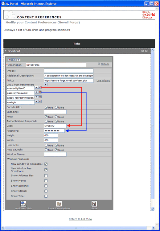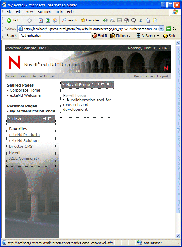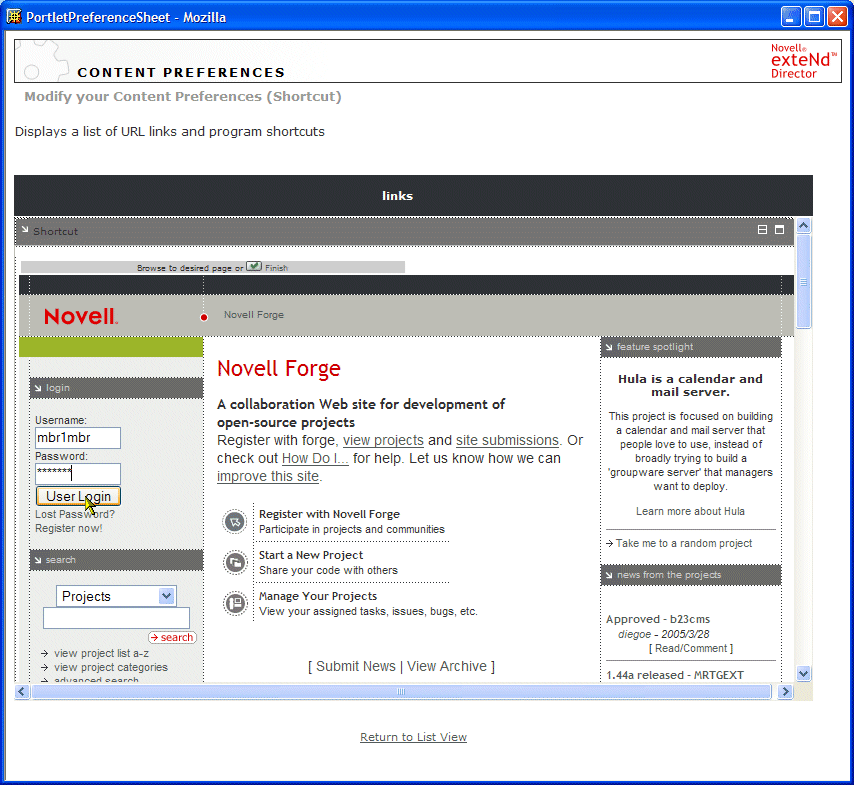 You are automatically logged in to the Novell Forge application. When you clicked the Novell Forge shortcut link, the Shortcut portlet used form-based authentication to post the credentials from a persistent data store, the exteNd Director database.
