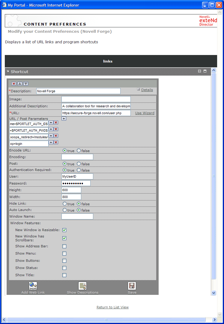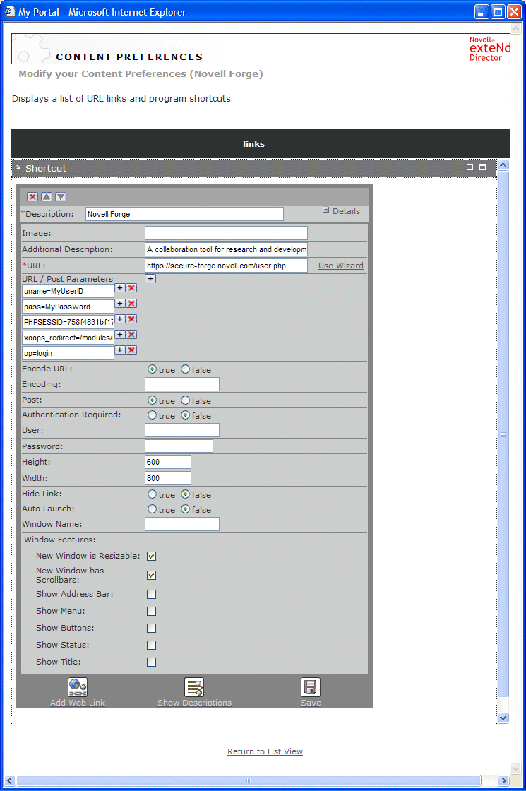 The Shortcut preferences sheet opens in the wizard, automatically configured for form-based authentication. Note that Post is set to true and that several URL/Post parameters are defined for the Novell Forge site, including the username and password you entered in Step 7, as in this example: