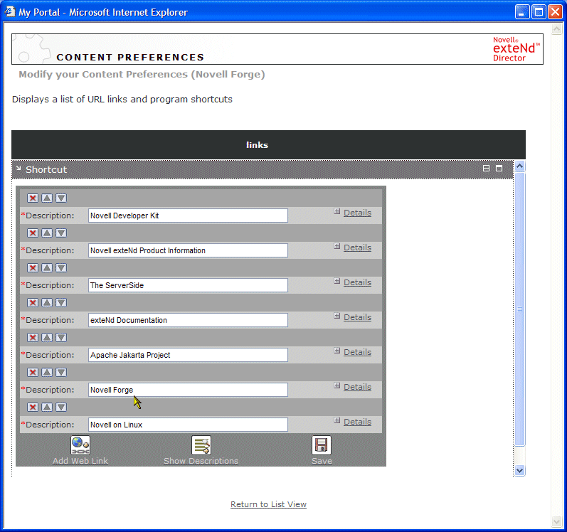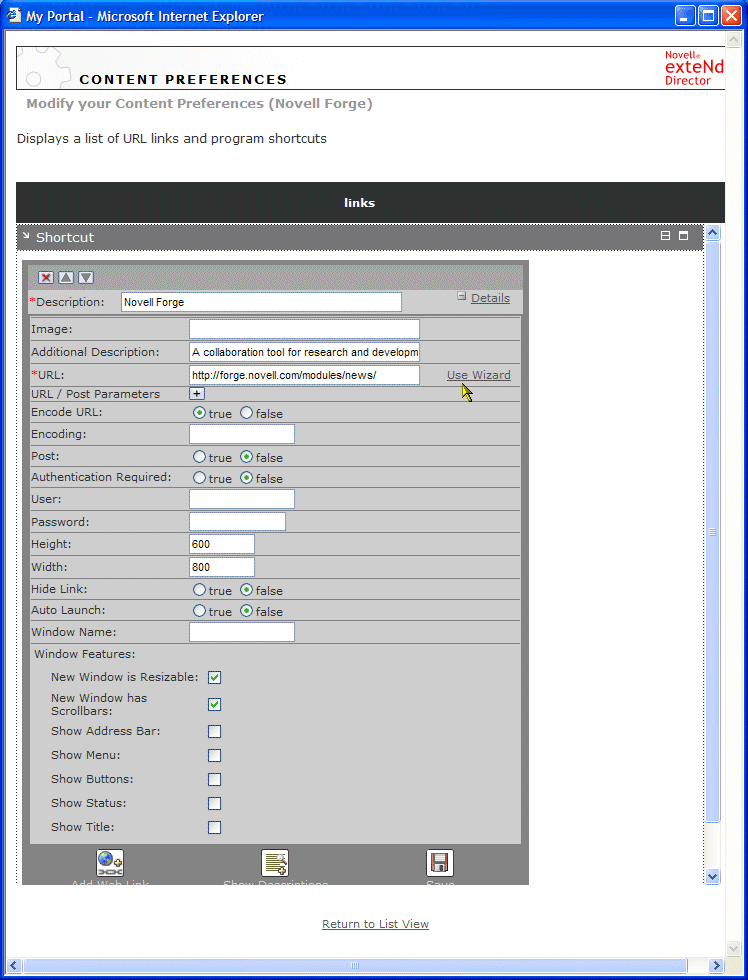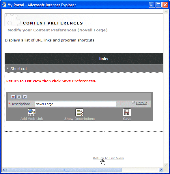 Now you are ready to add a Shortcut portlet to the new personal page. You will configure the portlet to use form-based authentication when logging in to the Novell Forge site. Leave the Personalizer running and move to the next exercise.