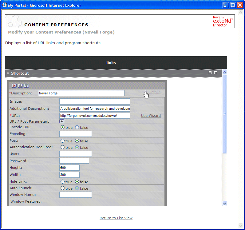 Display the preferences for the Novell Forge shortcut by clicking the plus sign to the left of Details: