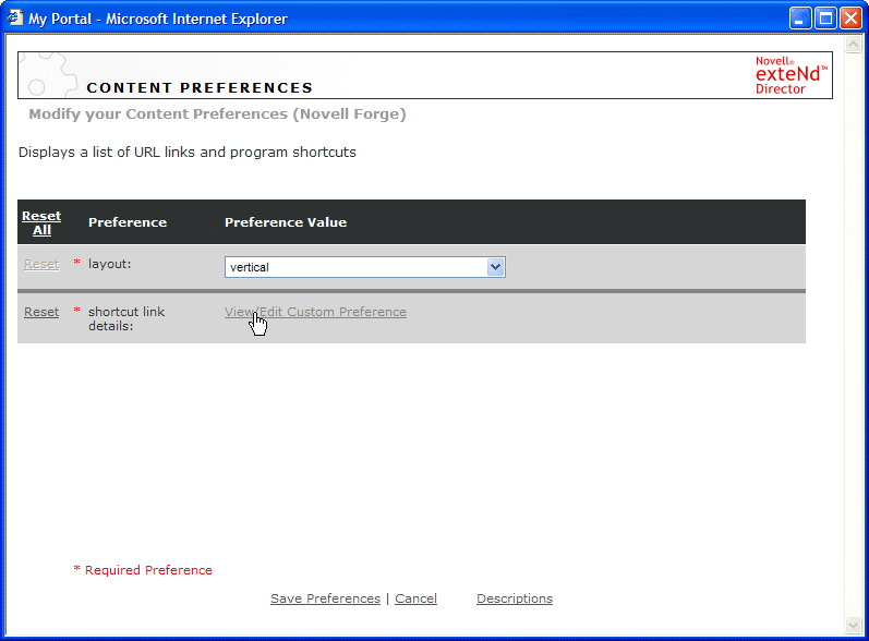 Click View/Edit Custom Preference to open the preference sheet for the Novell Forge shortcut link.
