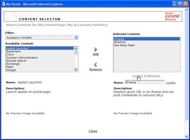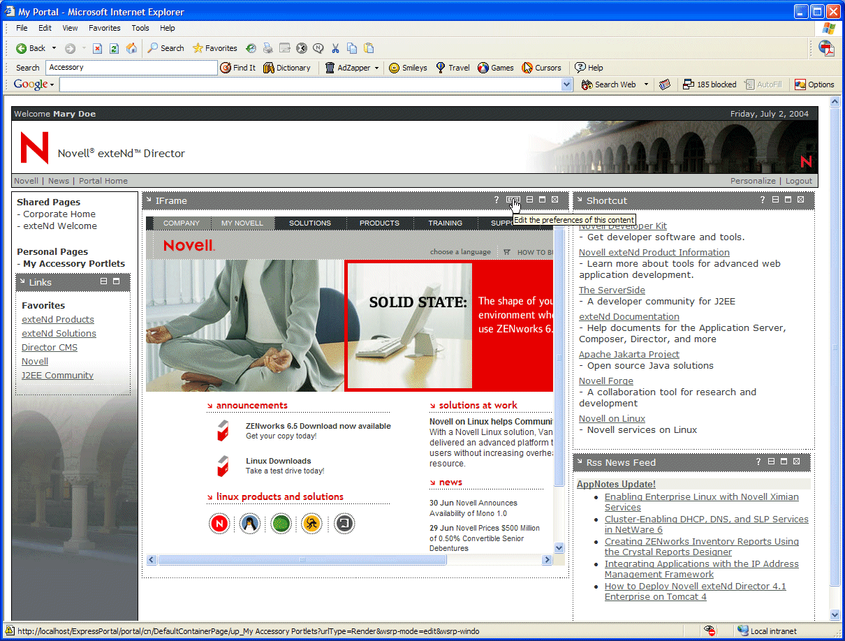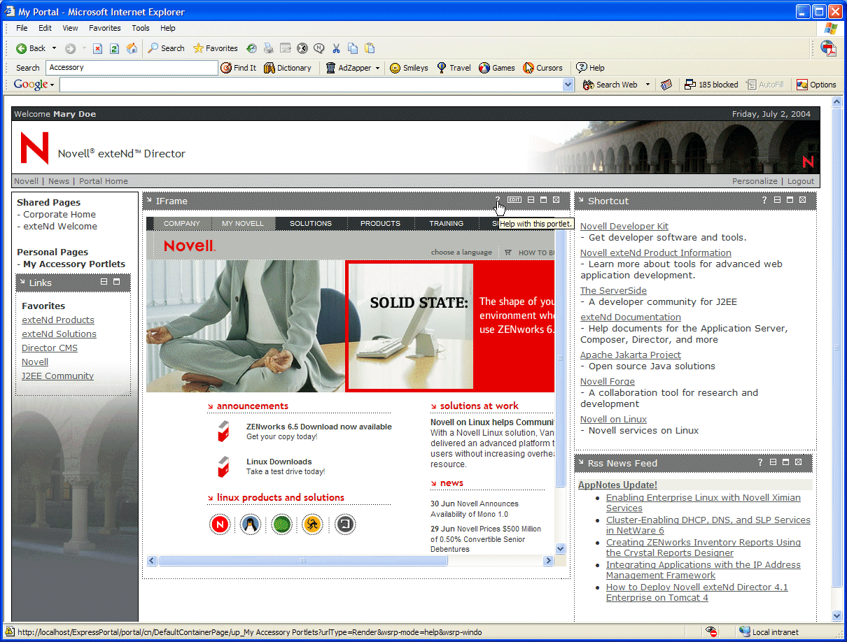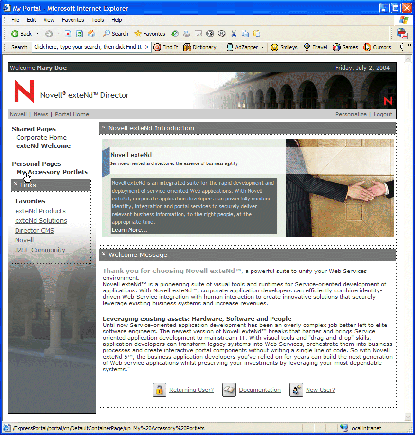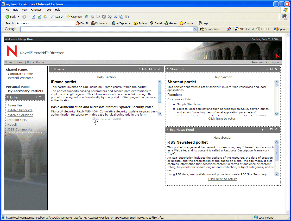 Accessory portlets are a set of production-quality portlets that you can use on personal or shared pages in the ExpressPortal project or in your own exteNd Director project. They provide rich interaction with web sites, access to local applications, form-based authentication, and other functions of interest to general users. Some of the accessory portlets have been converted from Novell Portal System (NPS) gadgets. All of the accessory portlets conform to the Java Portlet 1.0 specification.