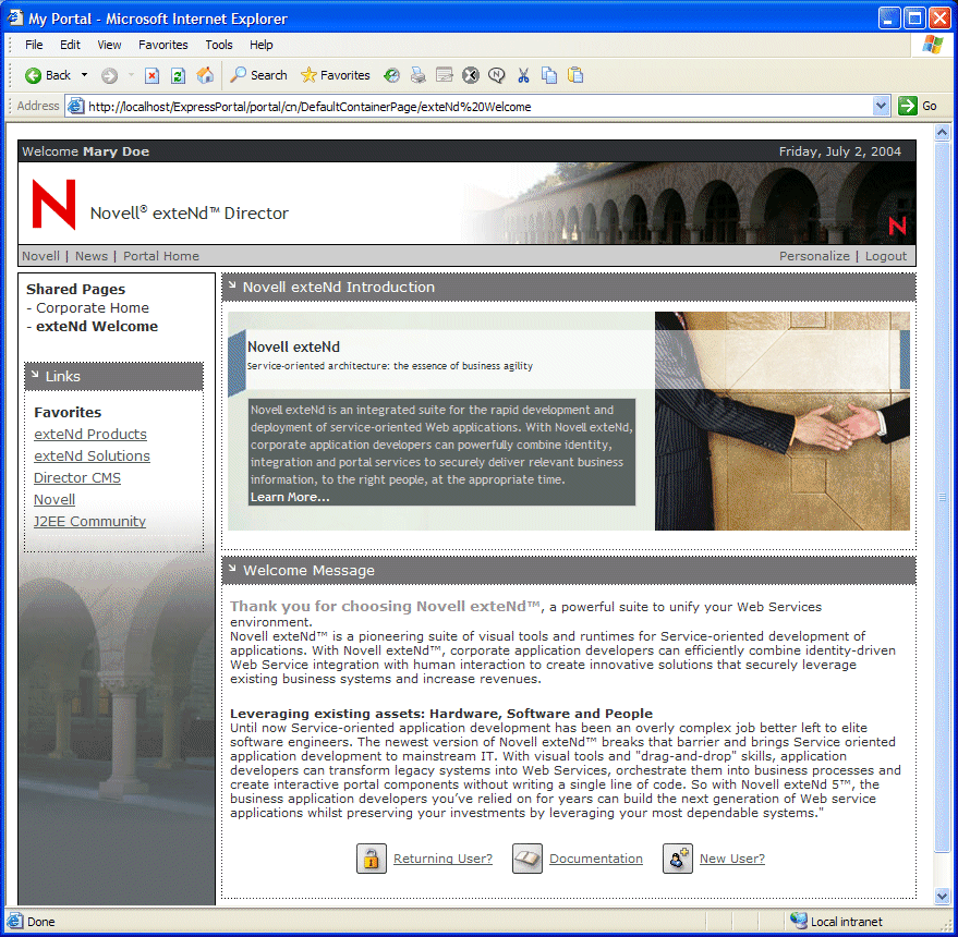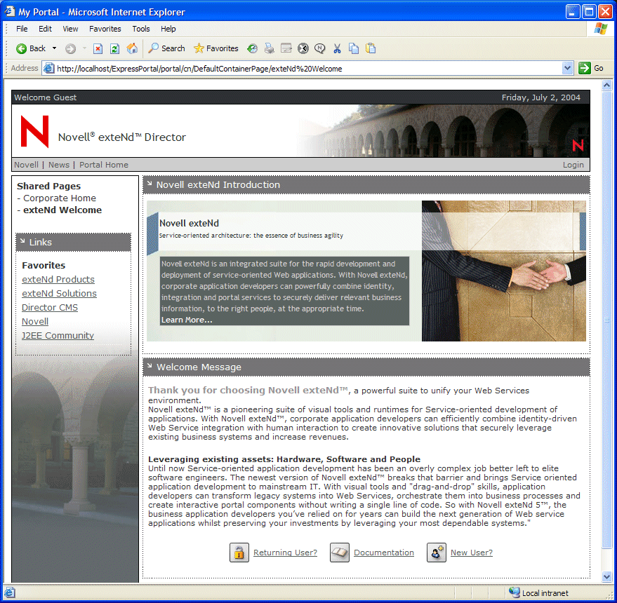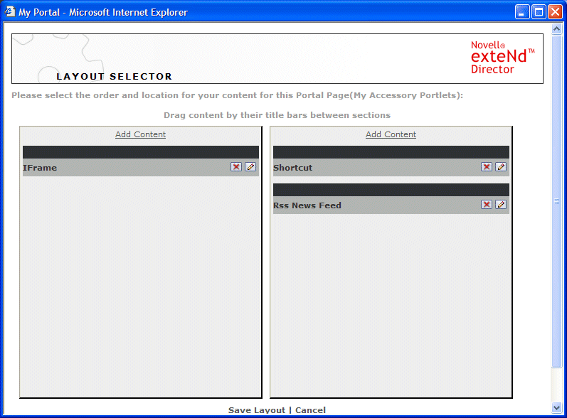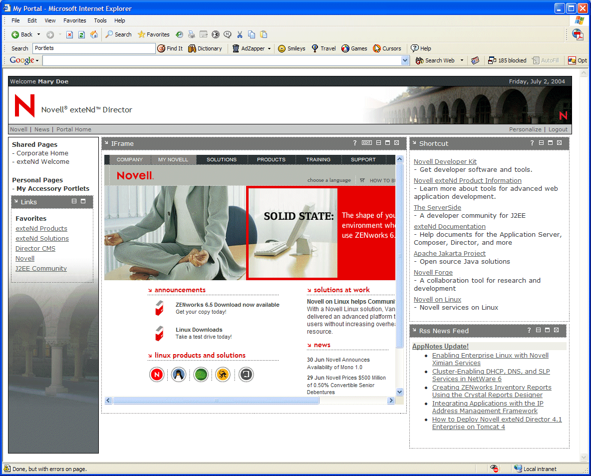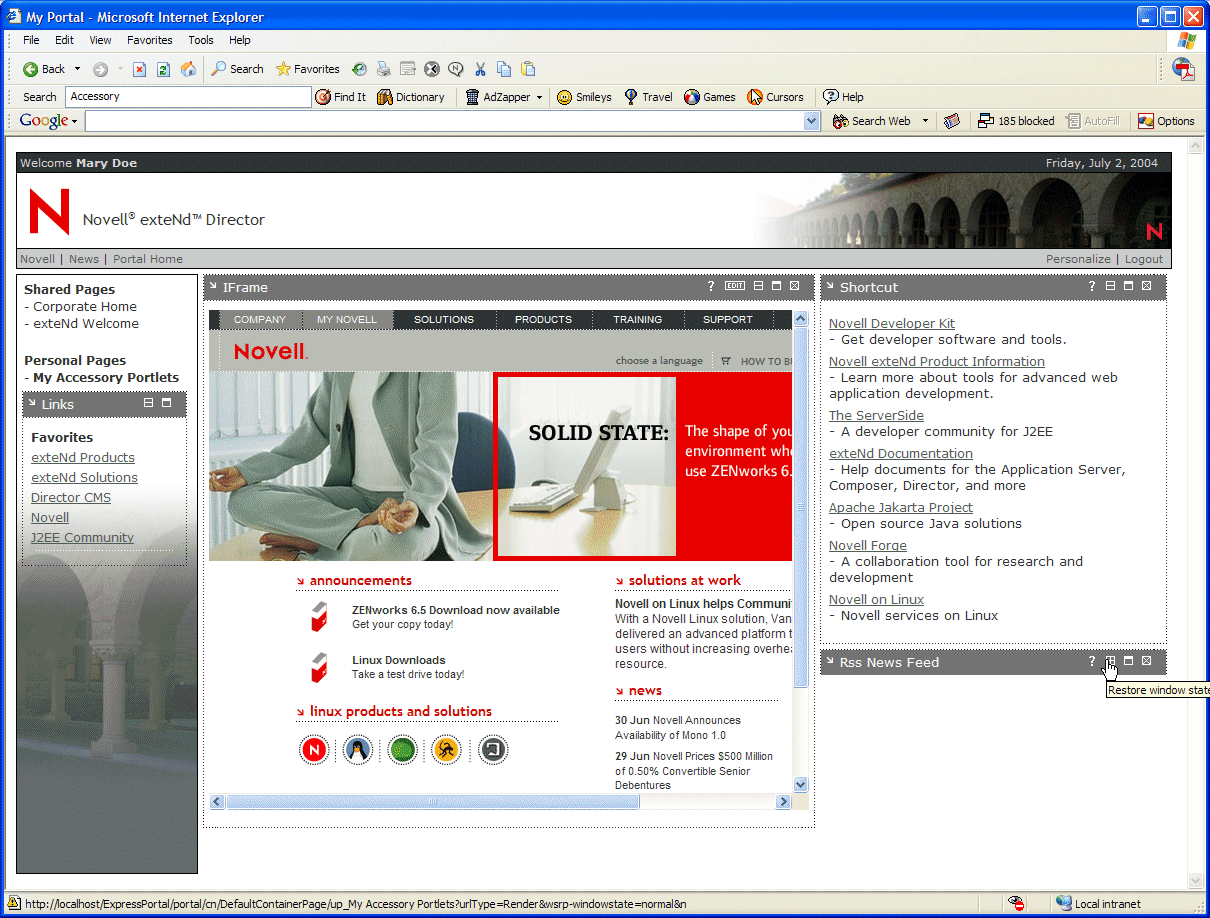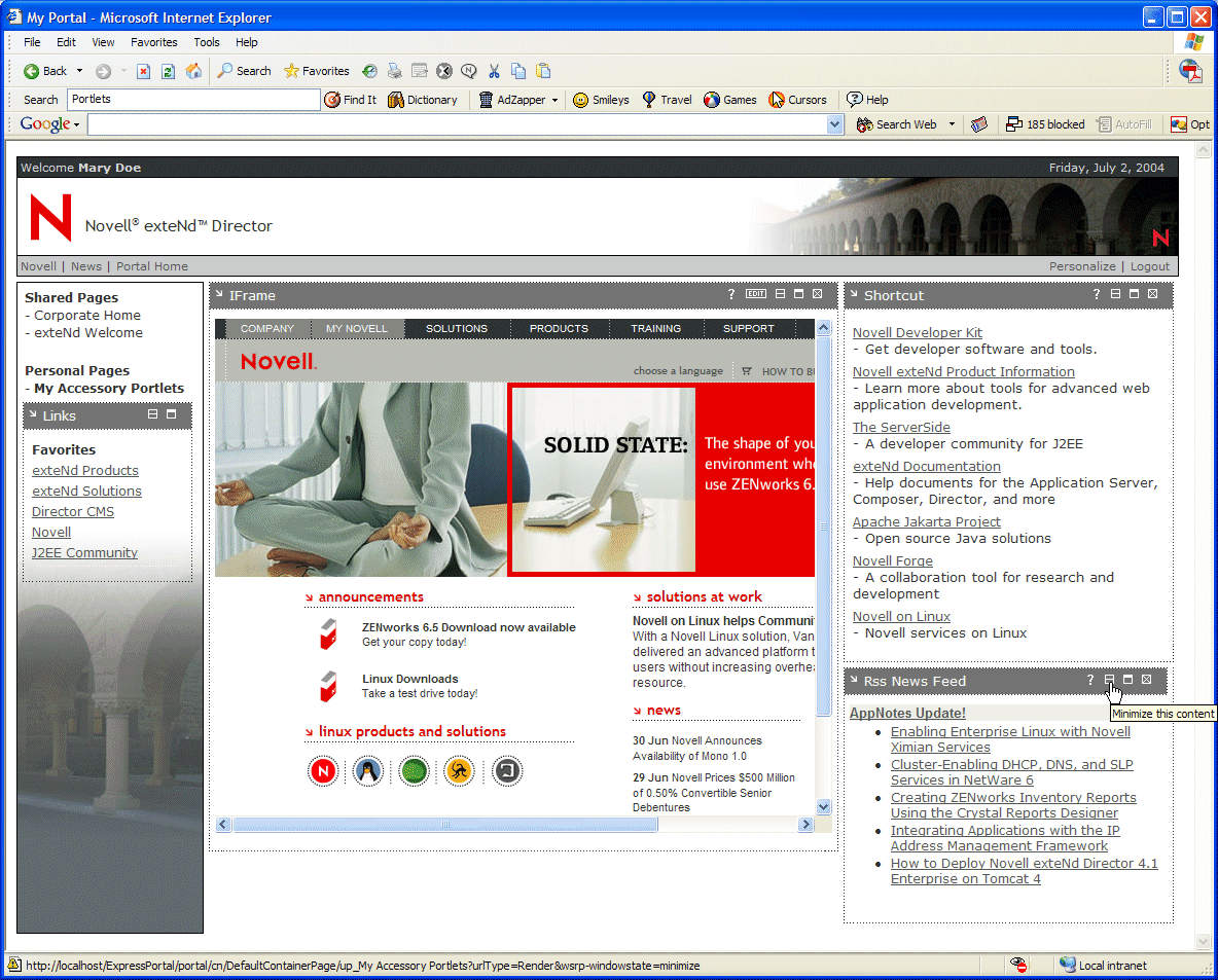 Accessory portlets are a set of production-quality portlets that you can use on personal or shared pages in the ExpressPortal project or in your own exteNd Director project. They provide rich interaction with web sites, access to local applications, form-based authentication, and other functions of interest to general users. Some of the accessory portlets have been converted from Novell Portal System (NPS) gadgets. All of the accessory portlets conform to the Java Portlet 1.0 specification.