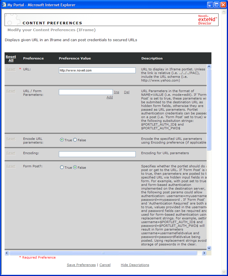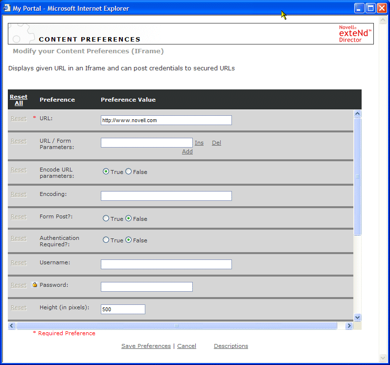 NOTE: The IFrame portlet also has an edit option that allows you to access and modify the preferences defined for this portlet: