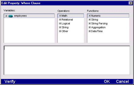 For complete information on the SilverStream operators and built-in functions, see Expressions, operators, and built-in functions in the online General Reference.