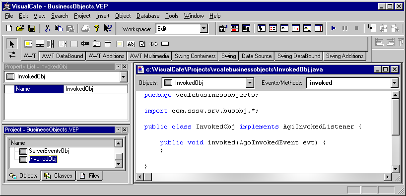 To create these objects in VisualCafe, you must implement specific interfaces from the SilverStream API--or in the case of servlet business objects, the standard javax.servlet.Servlet interface. A single business object class definition can implement more than one of these interfaces.