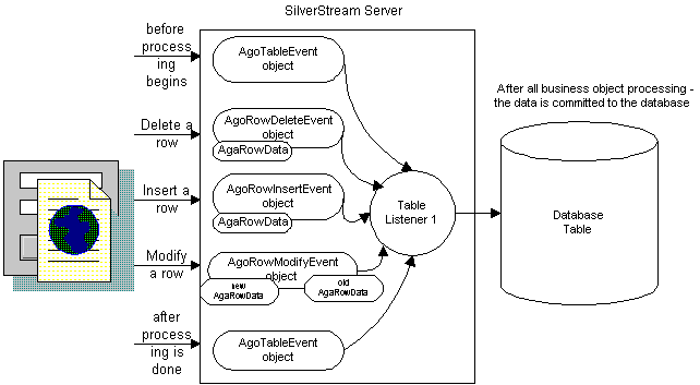 A table-modified triggered business object (or table listener) is a type of SilverStream business object that implements the AgiTableListener interface. Objects that implement this interface are registered with the application server to listen for table events, including row updates, row inserts, and row deletes. To be a registered listener means that the object tells the server that it wants to be notified when a modification occurs on a specific database table. The server uses events as the mechanism to notify the listener of a modification. Table listeners reside in a database and execute on the server.