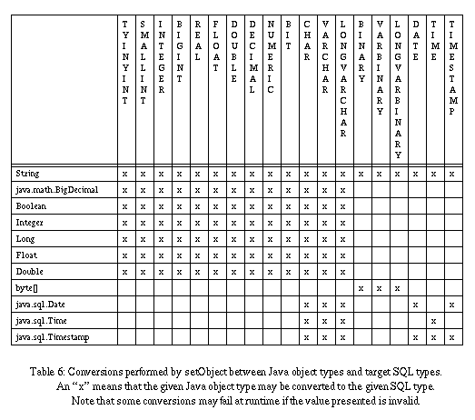 The corresponding default mapping from Java Object types to SQL types is show in Table 5.