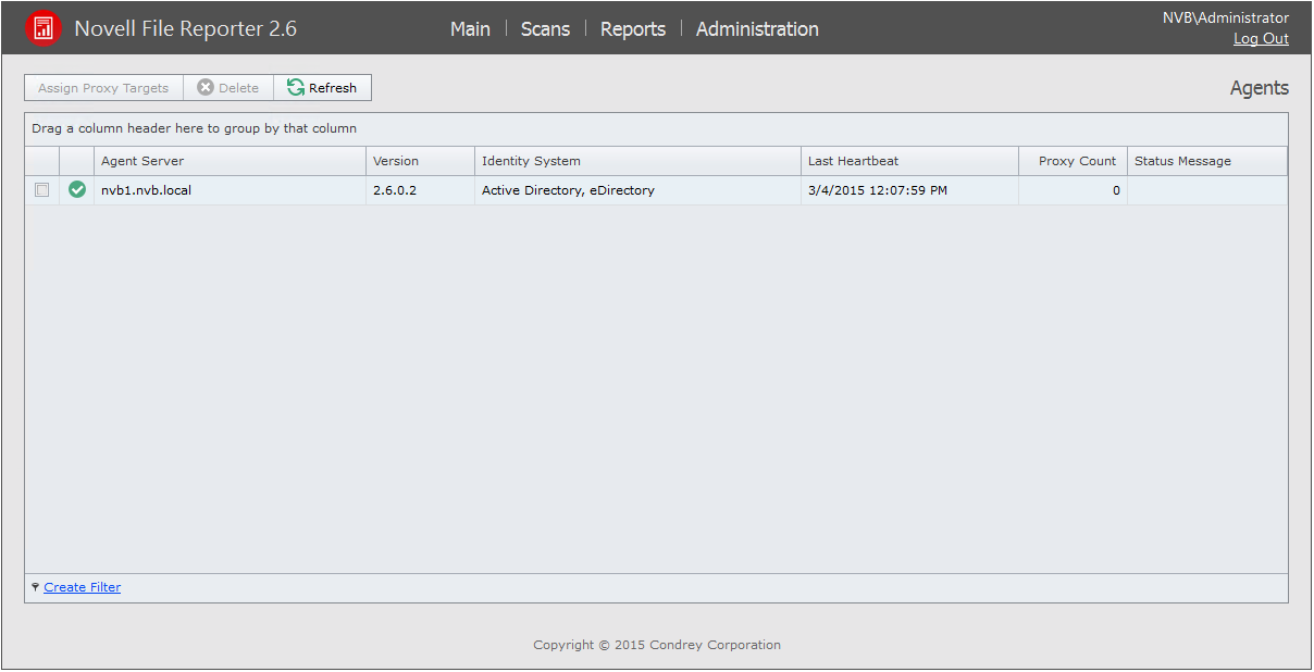 Novell File Reporter does not include a NetWare NFR Agent. Furthermore, an NFR Agent cannot be deployed on a NAS device or server cluster. Finally, some organizations might not want NFR Agents deployed on every server. In situations such as these, you can have a deployed NFR Agent on another server function as a proxy agent.