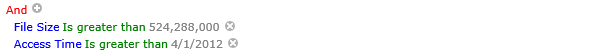 For example, in the example below, the files would appear in the report only if they were greater than 500 MB and had been accessed after April 1, 2012.