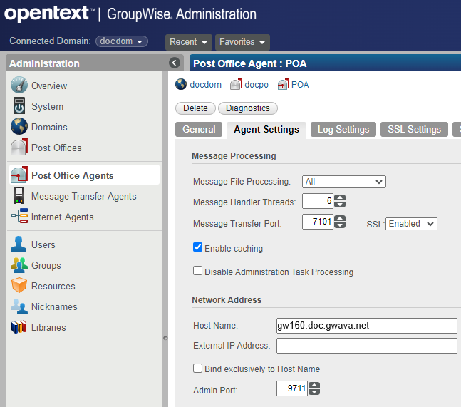 Log in to the Groupwise Administration Console, and navigate > Post Office Agents > selected POA > Agent Settings > Network Address > Host Name.