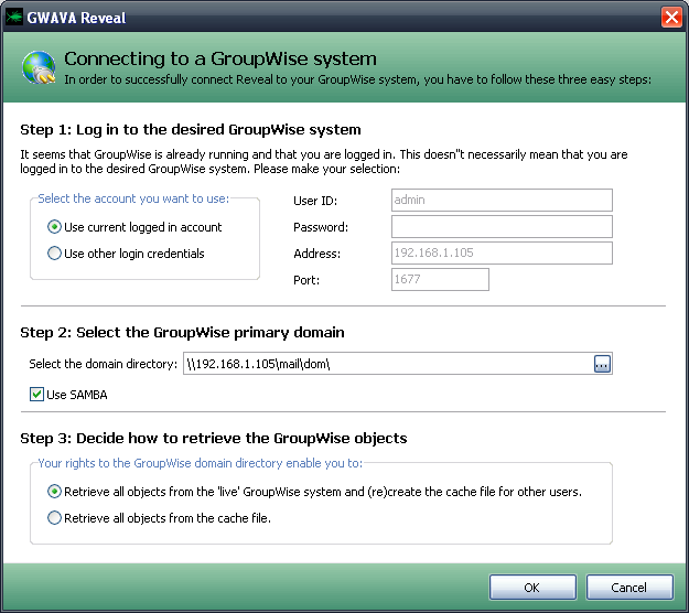 In order to connect to the GroupWise system, you must have access to the GroupWise domain database, either through the local machine or over the network, (if using a SAMBA share, you must select the ‘Use SAMBA’ box).