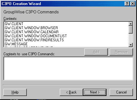 If you selected I want to handle standard GroupWise C3PO commands, the following dialog box is displayed. The Contexts list shows all available contexts in which you can use predefined GroupWise commands.