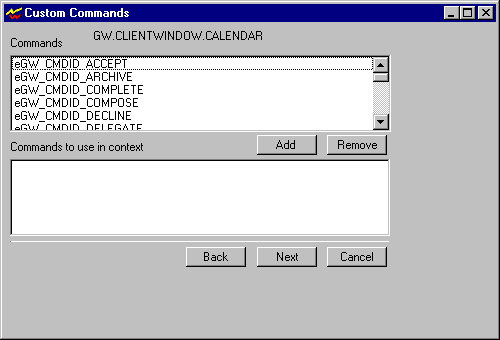 Repeat Step 1 for the context of each command you want to use, then click Next to display the Custom Commands dialog box. The Commands list shows the constant names for the predefined commands that you can control.