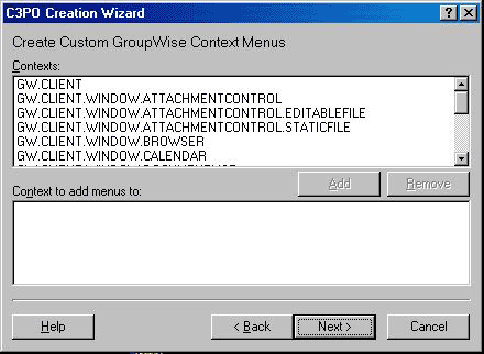 If you selected I want to customize the GroupWise context menus, the following dialog box is displayed. The Contexts list shows all available contexts for the GroupWise client, including any new custom classes that you have defined.