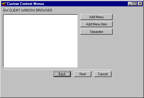Repeat Step 1 for the context of each menu you want to modify, then click Next to display the Custom Context Menus dialog box.