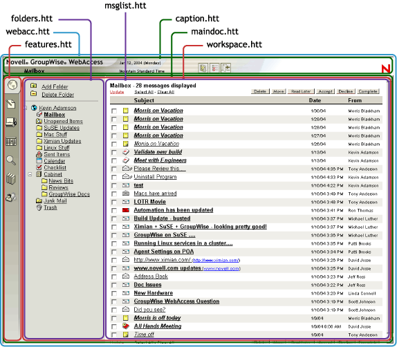 The base file is webacc.htt, which includes caption.htt and maindoc.htt. The maindoc.htt includes the features.htt and workspace.htt. Note that the interface for features.htt is showing that you are in the message view reading messages. The workspace.htt file contains folders.htt and msglist.htt. It is also used to toggle between other features, such as Document Management.