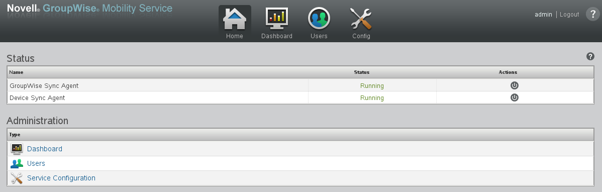The Mobility Service Installation program starts the GroupWise Sync Agent and the Device Sync Agent for you. Use the Mobility Admin console to check sync agent status.