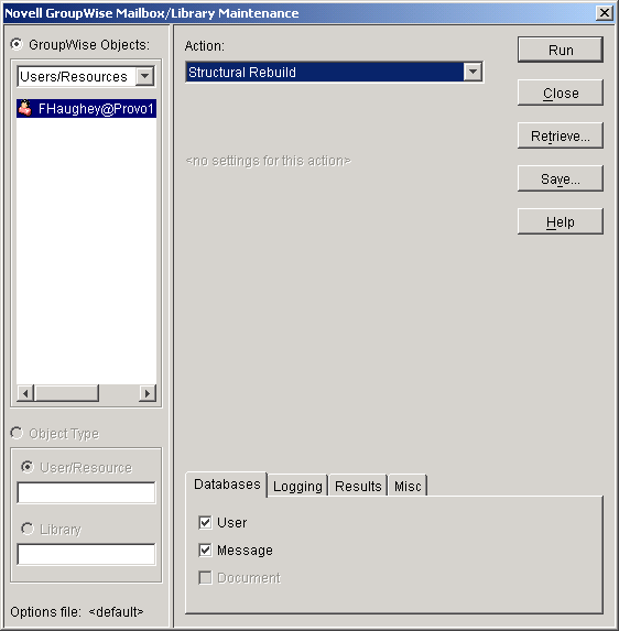 Selected options can be saved for repeated use. See Saving Mailbox/Library Maintenance Options.