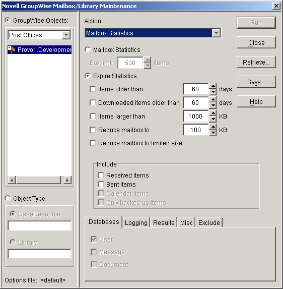 The Mailbox Statistics option in Mailbox/Library Maintenance collects and displays statistics about the post office, such as the number of messages and appointments in the post office and the average number per user. It is valid only for user databases. In addition, you can display any user mailboxes that have more than a specified number of items. This can help determine which users might be using an excessive amount of file server disk space.