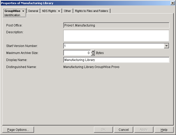 In ConsoleOne, browse to and right-click the Library object, then click Properties to display the library Identification page.
