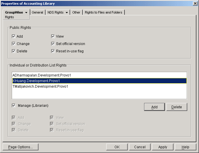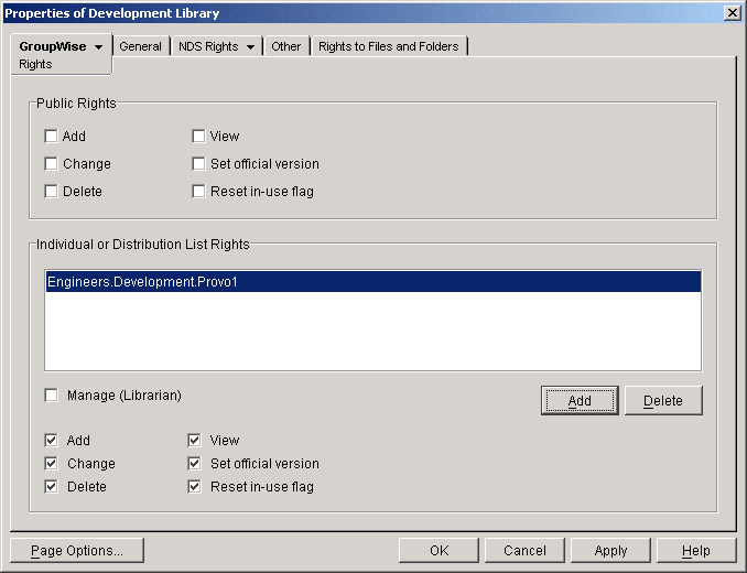 In addition to the six public rights, libraries also have a Manage right. When you grant the Manage right to a GroupWise user, you designate that user as a librarian. The Manage right gives the librarian full access to the properties of every document in the library. However, the Manage right does not grant the librarian direct access to the content of any document.