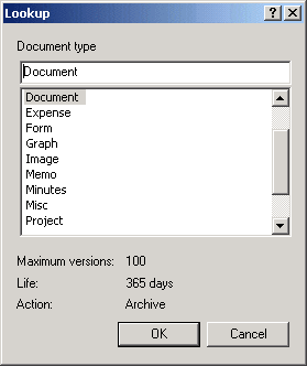 The Document Type property defines how a document is disposed of when its "life" in the system has expired. It is a required field. Users select a document type each time they create a new document.